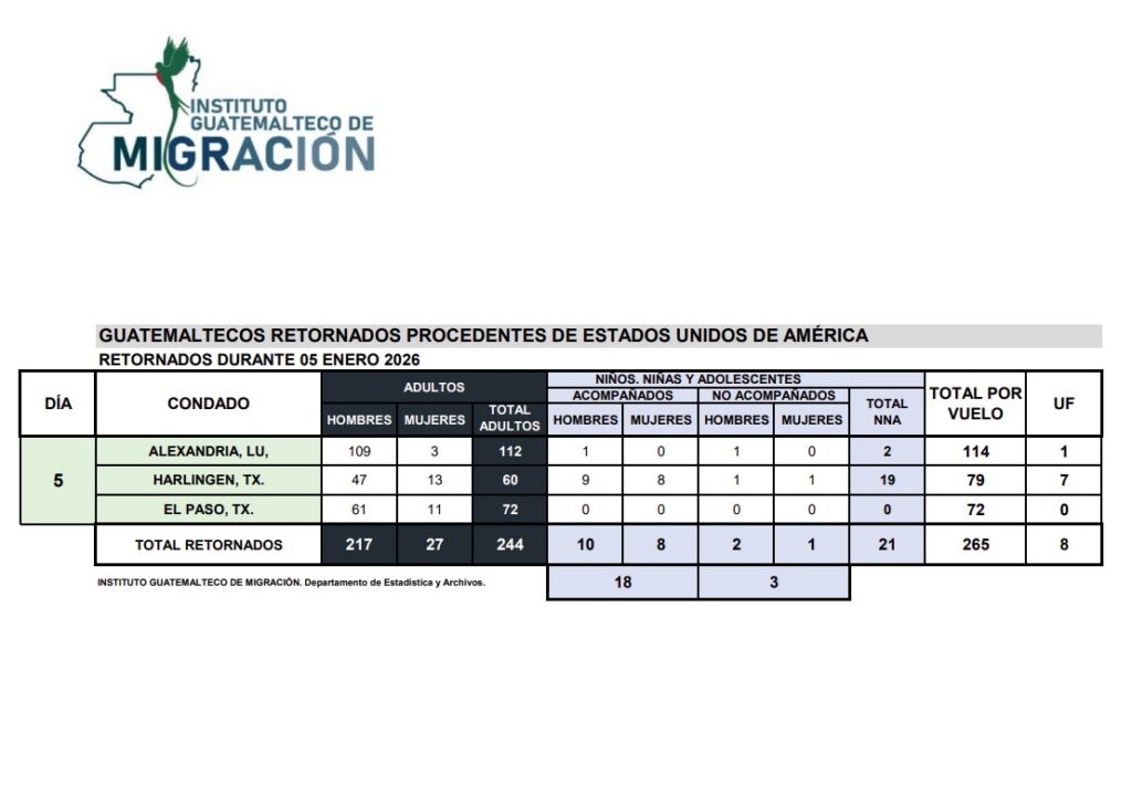Al cierre de la comparecencia, el titular del IGM presentó un balance del año 2025, el cual concluyó con 48,405 guatemaltecos deportados desde Estados Unidos, una cifra menor a los 61,680 registrados en 2024, aunque se reportó un incremento en los retornos durante los meses de octubre, noviembre y diciembre.
