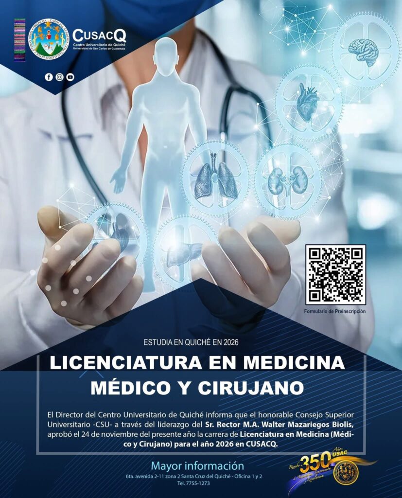 El Centro Universitario de Quiché (CUSACQ) marca un hito para la educación superior en el departamento al anunciar oficialmente la apertura de la carrera de Licenciatura en Medicina, Médico y Cirujano, que por primera vez se impartirá en territorio quichelense.